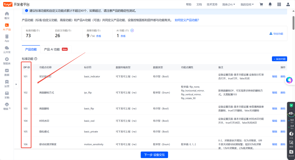 1.最左边的就是DP ID ,一般都是DP点 或者数据点,用来给设备识别和平时沟通使用的,比如使用某某DP点什么功能